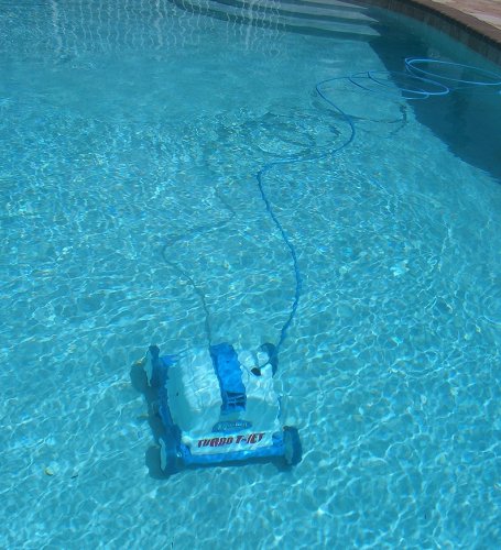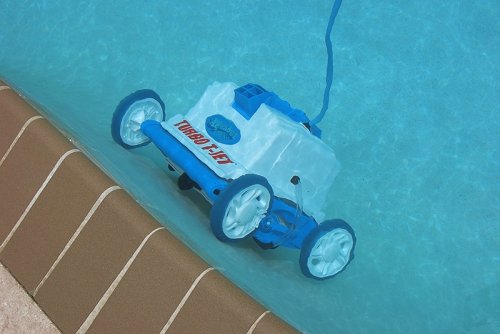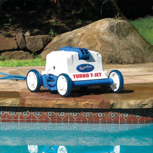 Designed and engineered for all types of pool surfaces, the Aquabot Turbo T Jet features extra-wide, non-marring polyethelyene wheels with wide-track chassis allowing it to glide over liner seams, wrinkles, footprints, maindrains and most other obstacles that can typically obstruct other cleaners. Cleans the entire pool floor and walls, including the scumline. The Aquabot Jet is powered by a pump motor that provides vacuum suction and jet-drive propulsion. The results are amazing speed and filtration power - covering up to 5,000 sq. ft. of surface per hour! With its own self-contained filter system and patented venturi jets, the Aquabot Jet can remove all types of debris, including sand, algae and even large leaves, while filtering up to 4,800 gallons of water per hour down to two microns! Comes complete with 51-feet of floating hose and a state-of-the-art digital program timer for ease of use.
