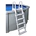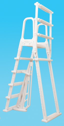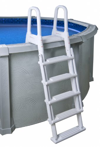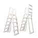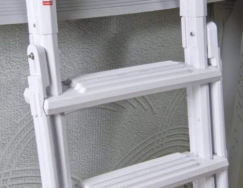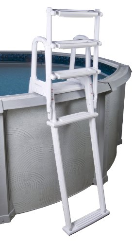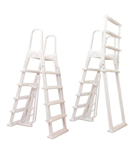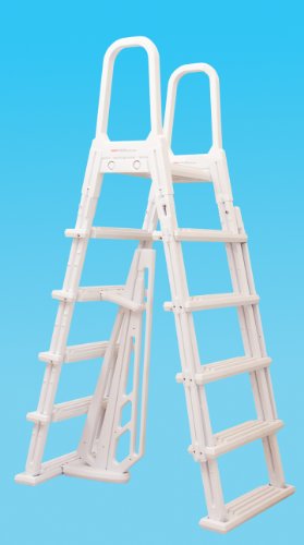 Sleek and sturdy ladder for easy entry and exit! Made from maintenance-free resin, this A-frame ladder has the durability you want and all the safety features you need without the high price. Outside ladder flips up and locks into place to prevent unwanted entry. Wide, 5" non-skid platform and treads for securefooting. Child-proof barrier under ladder prevents entrapment under ladder. Adjustable height for 48 to 54 deep above ground pools. Fill with sand to stabilize ladder (sand not included). Easy Assembly. 300 lb suggested weight limit. 3-Year Warranty.