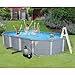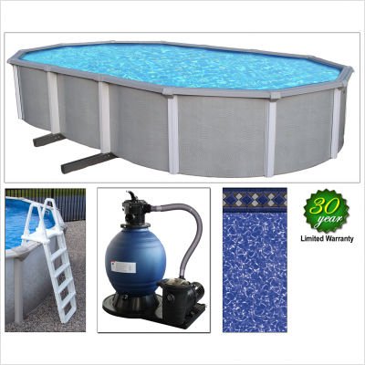 Designed to provide your family with years of backyard fun, this complete Zanzibar pool package includes everything you need to get swimming. This pool package includes : - 54-inch deep pool - a grand tile unibead liner - wide-mouth skimmer - A-frame ladder - sand filter system with a 1 HP pump. The Zanzibar has sturdy coated 8-foot top rail that will never rust, corrode or dent, and the uprights and sidewalls are made of durable, high-quality galvanized steel. This pool is impervious to water or chemical damage and is loaded with UV inhibitors to protect it from sunlight. Enjoy a vacation in your backyard now with this top-quality pool package. Assembly required. Backed by a 25 year warranty.