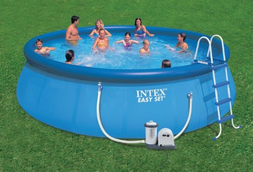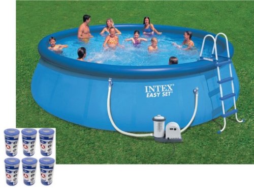 This complete INTEX Easy Set Pool will give your friends and family infinite hours of refreshing, fun activity and enjoyment. Get everything you need in one package with this Easy Set Pool Complete Kit. Includes a ladder, ground cloth, cover and 1,500 GPH pump for a pristine pool all season. Easy Set pools are much simpler and easier to set up and disassemble than any rigid steel walled pool. Bring the beach to your backyard with the Easy Set Pool Complete Kit from INTEX. This convenient set includes everything you need for a great pool experience, including the Intex 1500 GPH filter pump, 48" ladder, debris cover, ground cloth, and a six pack of filters! You could be ready for cool water in as as little as 30 minutes! Please Note: Proper installation of any above ground pool requires an area, sufficiently larger than the desired pool, to be leveled flat. Uneven ground, hills or holes must be leveled before pool assembly begins. If severely uneven ground prohibits level ground, proper installation will not be possible.