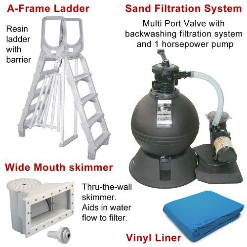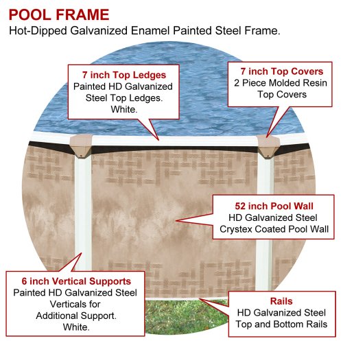 TA 2452GE-PKG Size: 24' W Features: -Includes a hot dipped galvanized G-90 wall with a multi layer protection system. -Pleasant looking wall pattern, a sturdy painted hot-dipped galvanized steel frame with zinc coated hardware. -20 Gauge all weather vinyl liner with lap-welded seams. -Heavy duty structural foam molded resin ladder with swim thru-barrier and removable outside staircase. Pool Type: -Hard sided pool. Pool Shape: -Round. Wall Type: -Hard. Color: -Grey. Primary Material: -Steel. Ladder Included: -Yes. Liner Included: -Yes. Filtering System Included: -Yes. Size 18' W - Water Capacity: -8246 Gallons. Size 24' W - Water Capacity: -14662 Gallons. Size 27' W - Water Capacity: -18562 Gallons. Generic Dimensions: -Filter: 19''. Dimensions: Water Depth: -52 Inches. Size 18' W - Overall Height - Top to Bottom: -52 Inches. Size 18' W - Overall Width - Side to Side: -18 Feet. Size 18' W - Overall Length - Front to Back: -18 Feet. Size 24' W - Overall Height - Top to Bottom: -52 Inches. Size 24' W - Overall Width - Side to Side: -24 Feet. Size 24' W - Overall Length - Front to Back: -24 Feet. Size 27' W - Overall Height - Top to Bottom: -52 Inches. Size 27' W - Overall Width - Side to Side: -27 Feet. Size 27' W - Overall Length - Front to Back: -27 Feet.