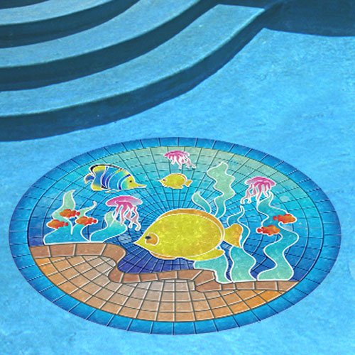 Small pool mosaic emblem features brightly colored tropical fish with mosaic tile appearance. Also available with 59" Diameter.