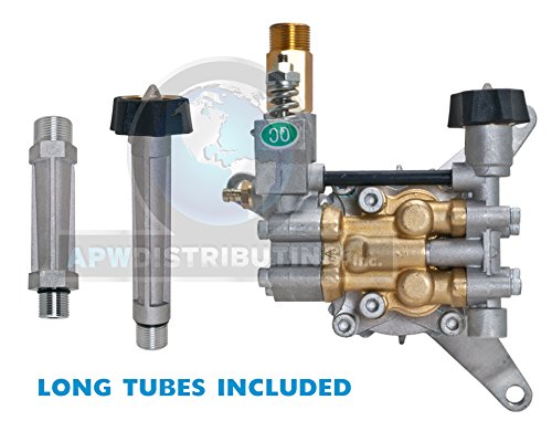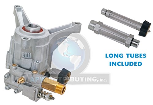 NEW Upgrade Replacement Pump 020453 SKU: 1001.7928 Never need to add or change pump oil MANUFACTURER and SELLER WARRANTY - FACTORY TESTED Max. volume: 2.2-2.5 GPM Max. discharge pressure: 3,000 PSI Max. pump speed: 3,500 RPM Shaft diameter: 7/8" (hollow) Built-In unloader and chemical injector Built-In easy start valve Stainless steel plungers Weight: 7.5 lbs Inlet port ¾" FGH with EZ Grip connection (garden hose) LONG TUBE Outlet connection: 22mm (as shown) LONG TUBE Includes Engine Shaft Key and Thermal Brass Relief Valve Our Pumps use the proper BRASS thermal relief valves, not the aluminum version. Aluminum reacts with the water (electrolysis) and accumulates calcium and lime deposits that stop the valve from opening when the pump water gets too hot. When this happens it destroys the soft internal parts inside the pump (seals, valves, unloader). Unit may require longer mounting bolts, which can be obtained from your local hardware store.